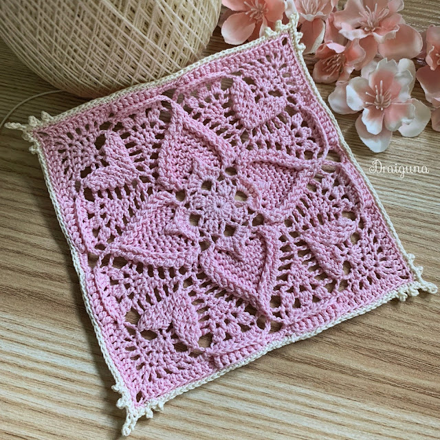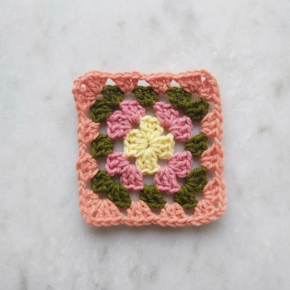 The finished square is about 4.5" x 4.5", making it ideal for blankets, pillows, bags—or mixing into a sampler afghan when you want a pop of floral texture.