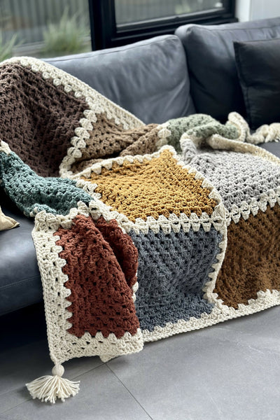 Description: If you love granny squares but don’t want a long, never-ending motif marathon, this throw is such a satisfying compromise. You only make 9 large squares (each about 30 cm / ~12 in), then join them into a modern, graphic blanket that looks impressive without being complicated. It’s written for beginner-friendly success, and it’s especially fun if you want to play with color placement—go scrappy, keep it tonal, or use high contrast for a statement throw. The pattern is designed with bulky yarn (Hue + Me) and a 10 mm hook, so it works up quickly and has that cozy, chunky finish.