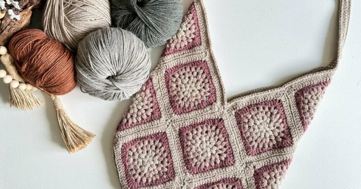 The full bag is assembled by seaming together 15 squares, and the tutorial covers the whole process, including creating the strap and adding neat finishing edges so it looks polished when you’re done. It’s also a great pattern if you like planned color palettes: the designer works it in three colors for that modern, coordinated look.