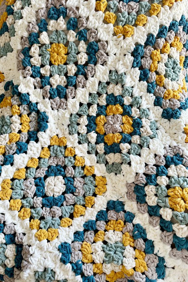 Description: If you want that classic granny-square look but in a modern, extra-squishy way, this pattern is such a fun one to try. It uses Bernat Blanket (super bulky chenille) and a 15 mm hook, so the squares grow quickly and feel instantly cozy.