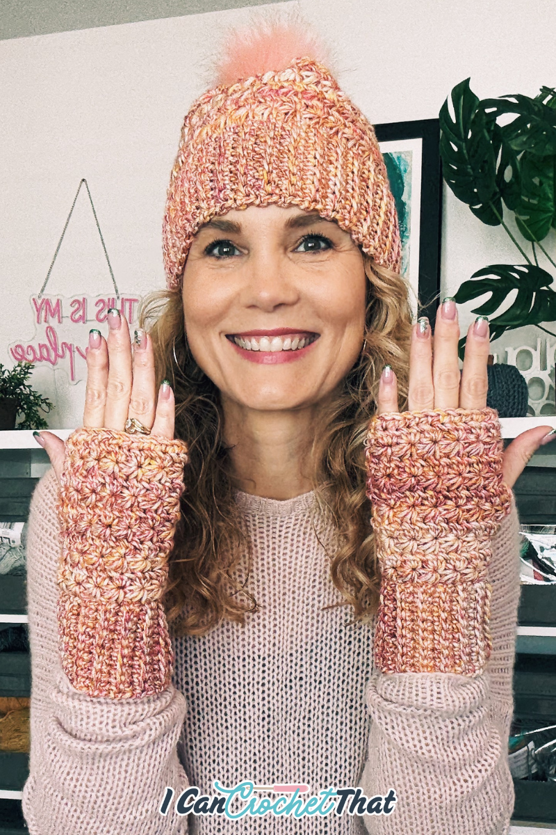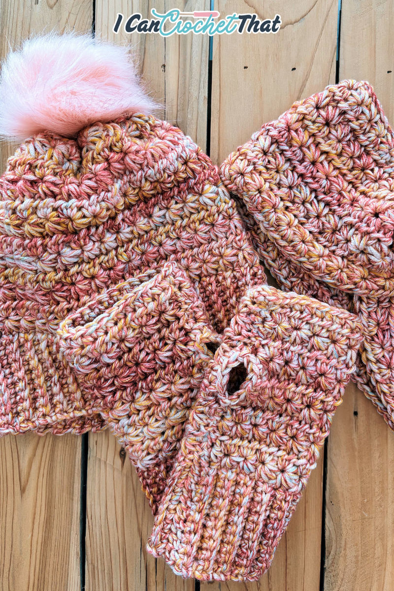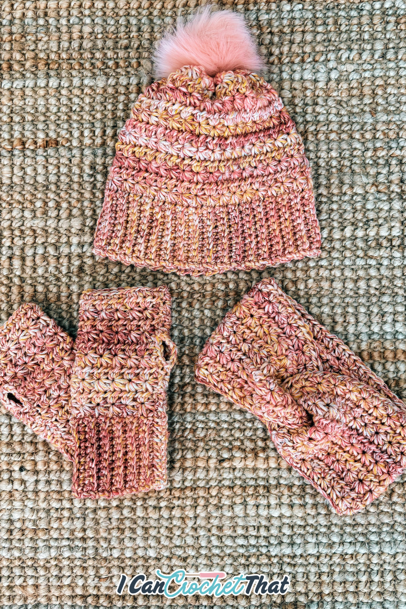 🎥 The fingerless gloves video tutorial shows the exact star stitch construction used in this hat.