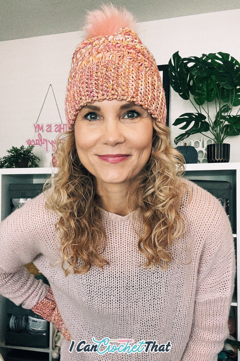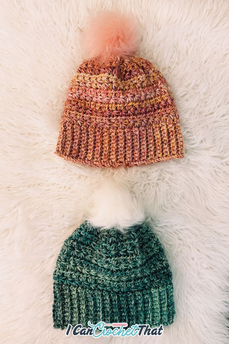 The construction is nearly identical, worked flat with the same star stitch pattern, with one key difference: instead of leaving an opening, we close the top to form a cozy beanie and finish it with a pom.