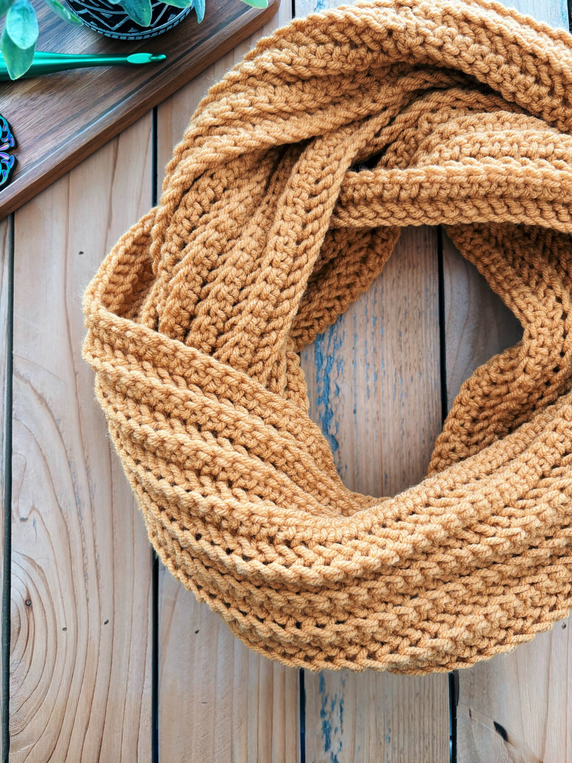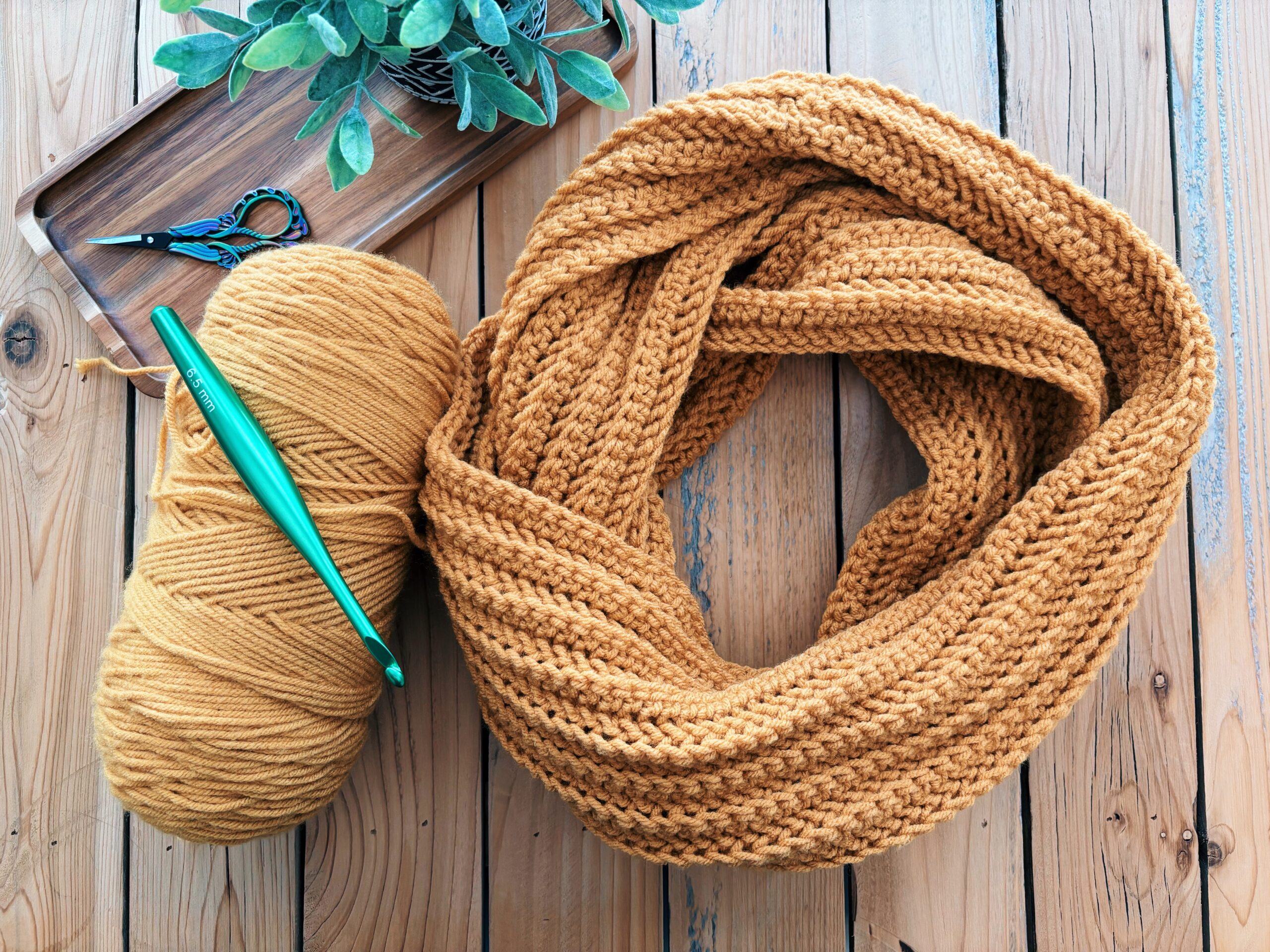 This revamped version uses Loops & Threads yarn in Mustard with a 6.5 mm crochet hook. The stitch pattern is a simple yet stunning herringbone half double crochet worked in the back loop only, which gives it beautiful texture and drape.