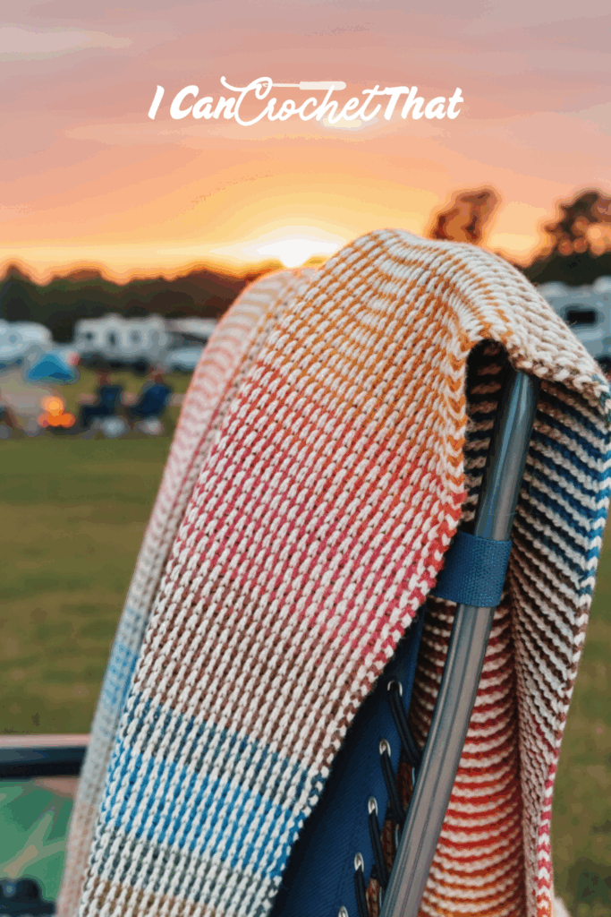 A striped crochet blanket draped over a chair at a campsite during sunset, with RVs and people in the background. Text reads, I Can Crochet That.