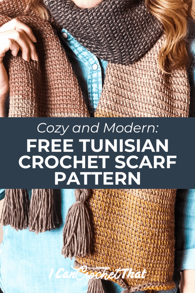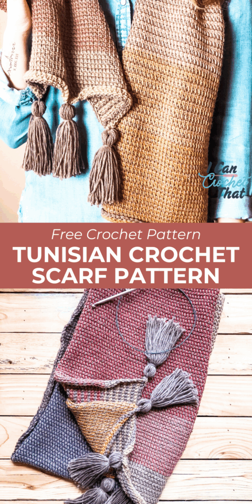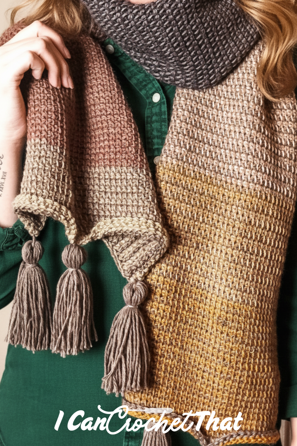 This gorgeous knit-like crochet scarf is made using Tunisian Simple Stitch, alternating two different colors of yarn. The result is a scarf with a squishy like feel and beautiful colors that will remind you of fall. The added tassels give this scarf the look and feel of something you picked up at a local boutique.